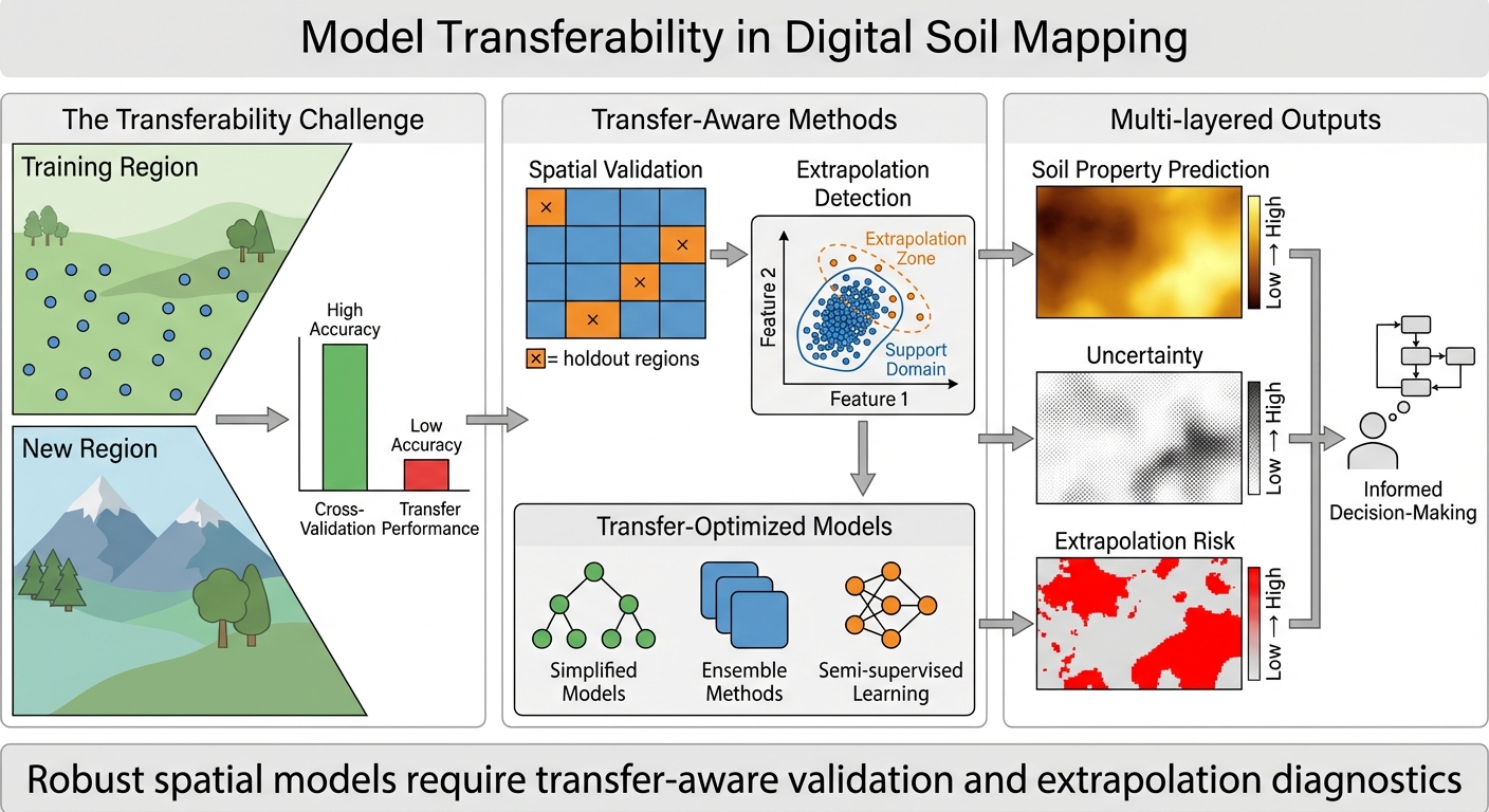 This project focuses on whether spatial prediction models remain reliable when applied beyond their training conditions—across new regions, scales, and covariate combinations. We use spatially robust validation designs (blocked CV, region holdouts) and diagnose where models extrapolate outside the training “applicability domain.” Outputs include prediction maps plus extrapolation-risk or similarity layers that show where results are well supported and where uncertainty should be higher. The aim is more trustworthy soil mapping under real deployment scenarios.