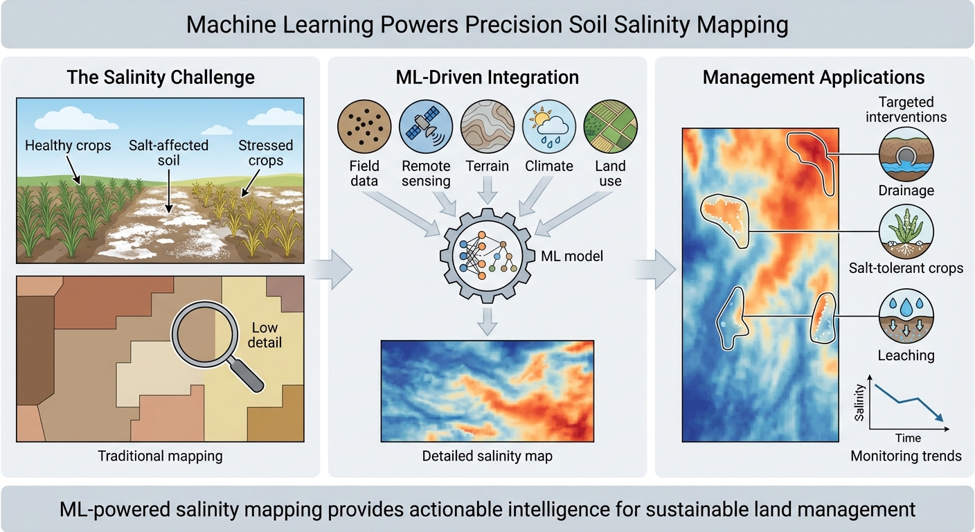 Maps salinity risk and trends using ML with terrain, climate, land use, and remote sensing to guide mitigation.