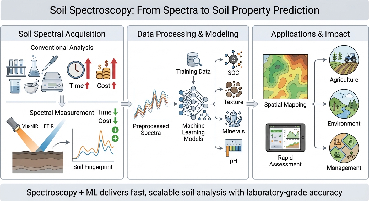 Predicts soil properties from spectral fingerprints using ML calibration, enabling fast, low-cost soil characterization.